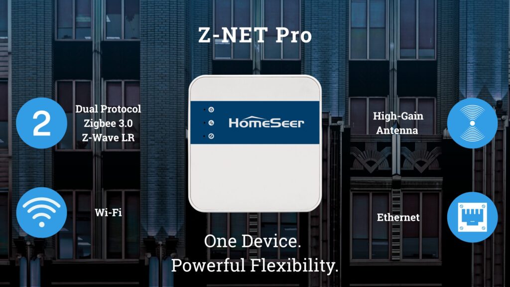 The Z-NET Pro is HomeSeer’s latest interface device. New and improved from our previous Z-Net it hosts a powerful specialty single-board computer and Dual Z-Wave LR + Zigbee 3.0 capability. It is currently on Pre-Sale now.