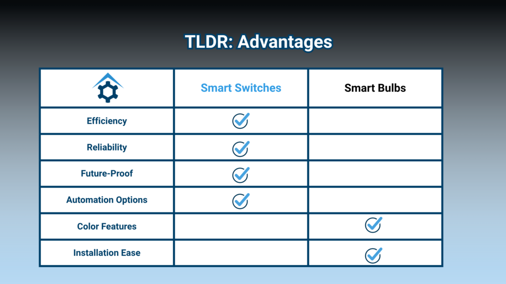 Behavior of your lighting will be more consistent with a smart switch. Smart switch implementation limits the number of end devices, can increase the signal range and fidelity through mesh networking as is the case with the WS300 and have less failure points than Smart bulbs. Overall leading to a more reliable system and experience.